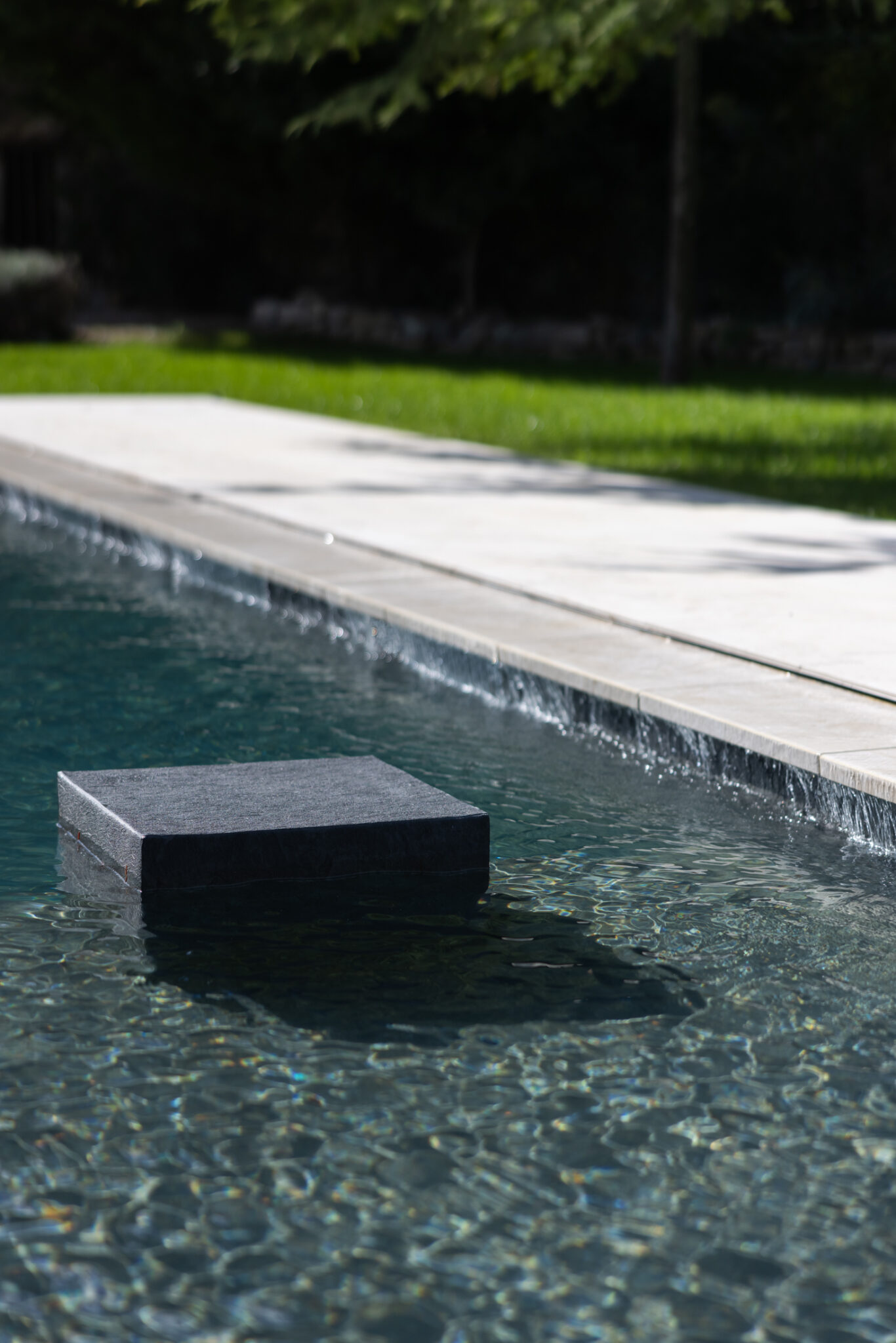 La lame d’eau coule sur tout le périmètre de la piscine… … créant un effet visuel et sonore très doux.