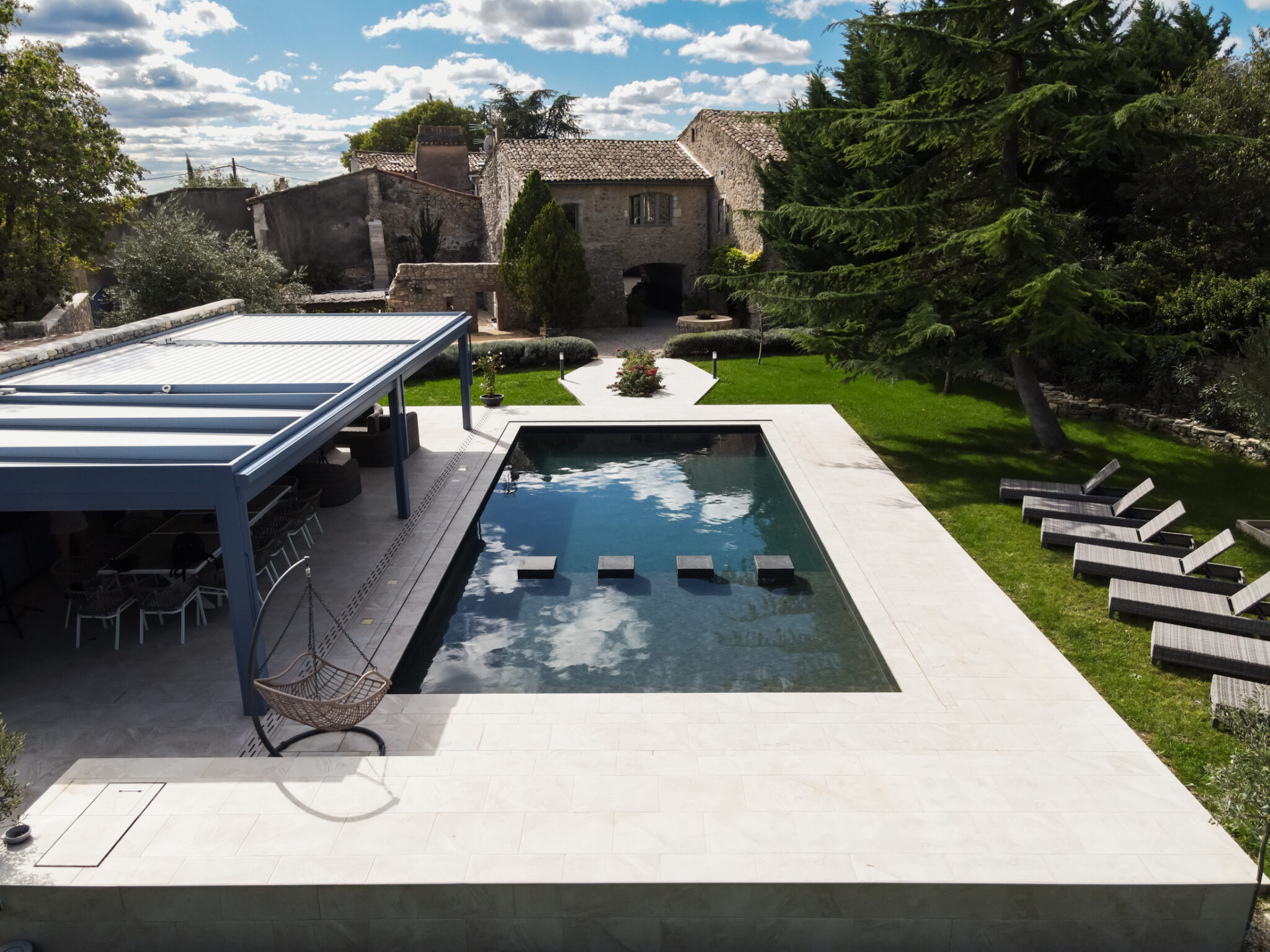 Il s’agit d’une piscine en béton 12×5,50m, équipée d’un revêtement PVC armé coloris gris anthracite avec des nuances de gris clair (effet 3D, la matière est en relief): cela donne un effet très naturel.