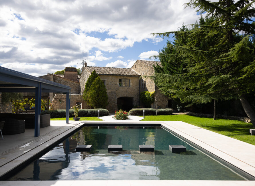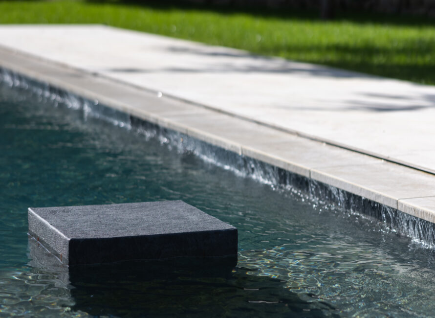 Explication: au lieu d’avoir un débordement qui sorte du bassin et s’écoule vers l’extérieur, l’eau arrive derrière la margelle et tombe dans le bassin. Il a fallu pour cela concevoir et fabriquer des pièces sur-mesure.