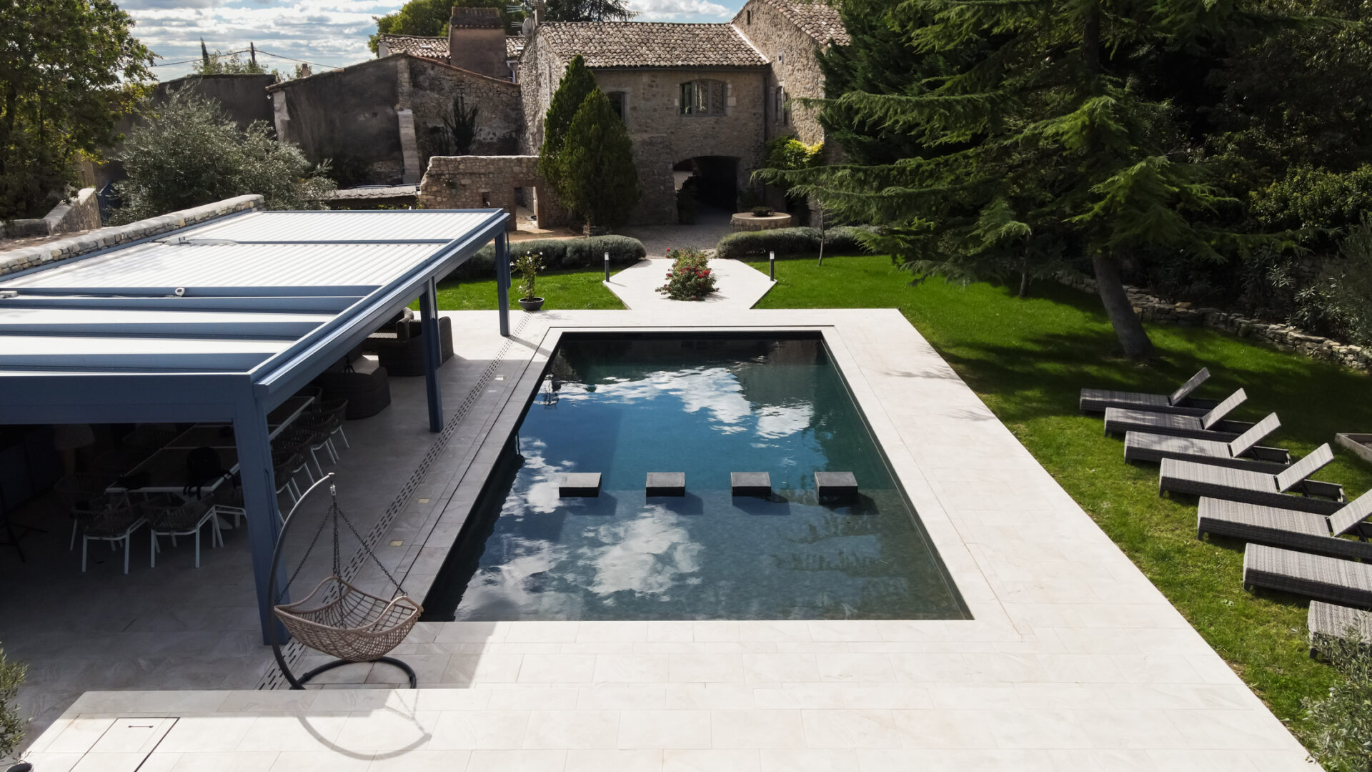 Il s’agit d’une piscine en béton 12×5,50m, équipée d’un revêtement PVC armé coloris gris anthracite avec des nuances de gris clair (effet 3D, la matière est en relief): cela donne un effet très naturel.