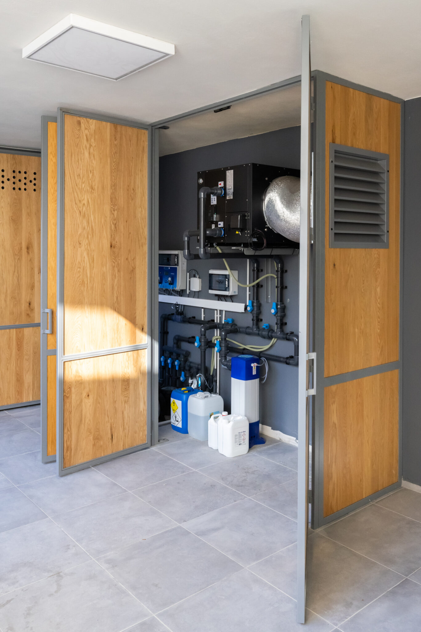 Le coffret électrique intelligent pilote toute la filtration, associée à un traitement automatique par injection d’oxygène actif et lampe UV. Une pompe à chaleur assure le chauffage, tandis que la pompe à vitesse variable optimise les performances. Le tout est discrètement installé dans un local technique sur-mesure, intégré dans un placard conçu par un menuisier et un ferronnier.