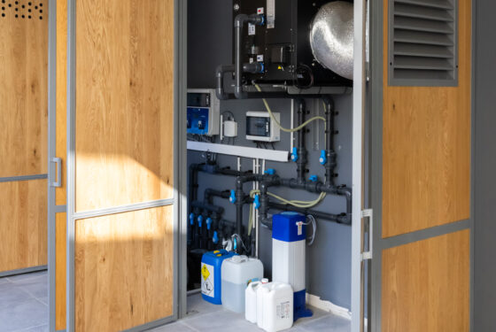 Le coffret électrique intelligent pilote toute la filtration, associée à un traitement automatique par injection d’oxygène actif et lampe UV. Une pompe à chaleur assure le chauffage, tandis que la pompe à vitesse variable optimise les performances. Le tout est discrètement installé dans un local technique sur-mesure, intégré dans un placard conçu par un menuisier et un ferronnier.