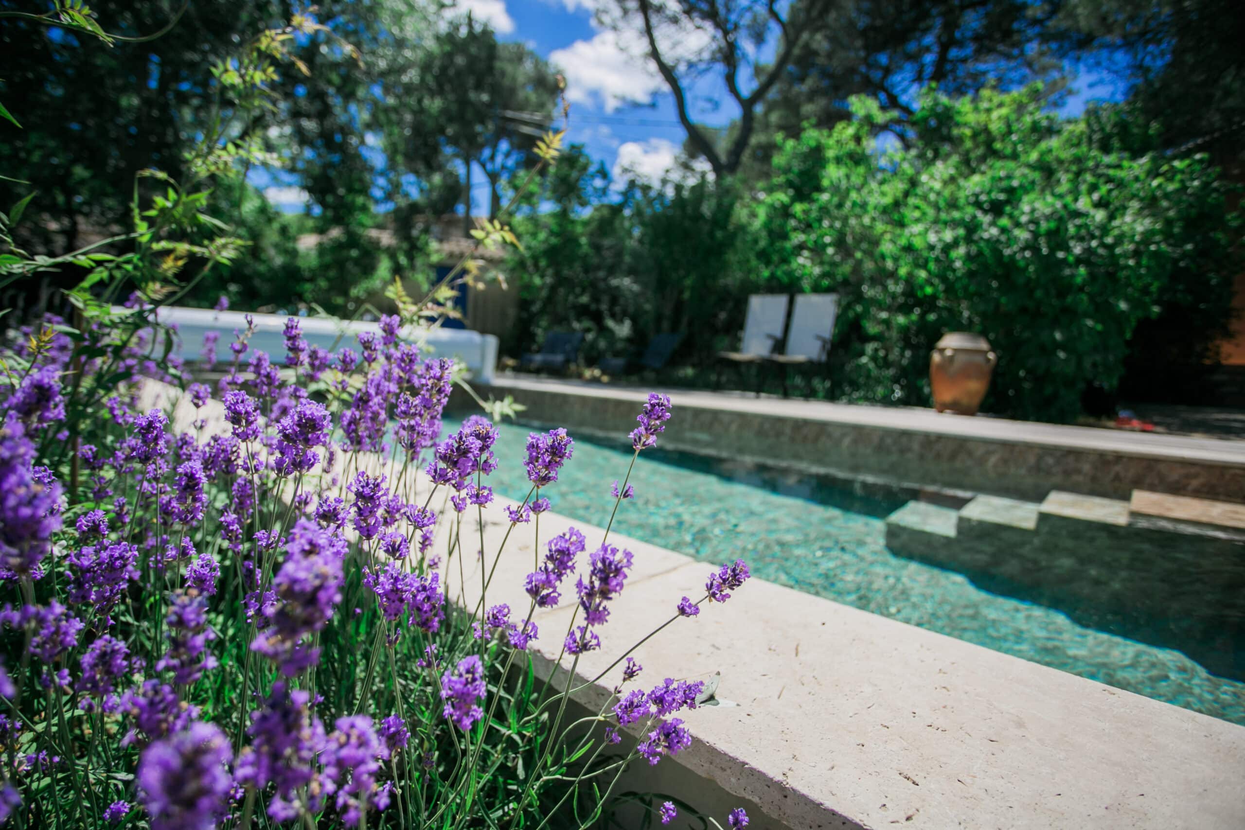 Cette piscine a été conçue pour s’inscrire parfaitement dans son environnement. L’aménagement paysager est composé de végétaux d’essences locales, de murets en pierres sèches, et des zones rocailleuses. La piscine est entourée d’espaces protégés et ombragés (pool-house, tonnelle, voile d’ombrage). Des endroits agréables pour s’accorder une pause.