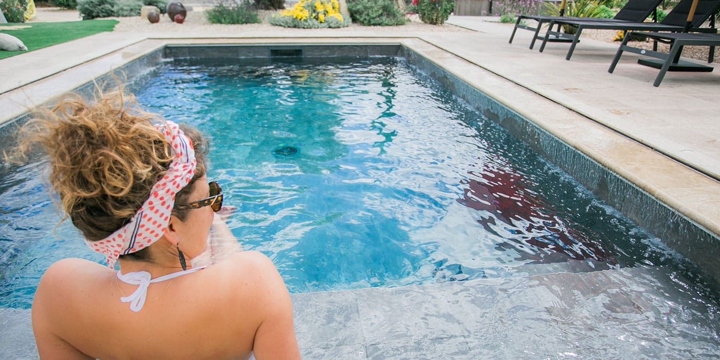 La piscine de notre showroom est aménagée comme un lieu de vie extérieur, ce qui est très prisé dans la région. Une banquette immergée crée un espace ludique pour les plus petits, mais aussi un espace rafraîchissant et reposant pour les plus grands.