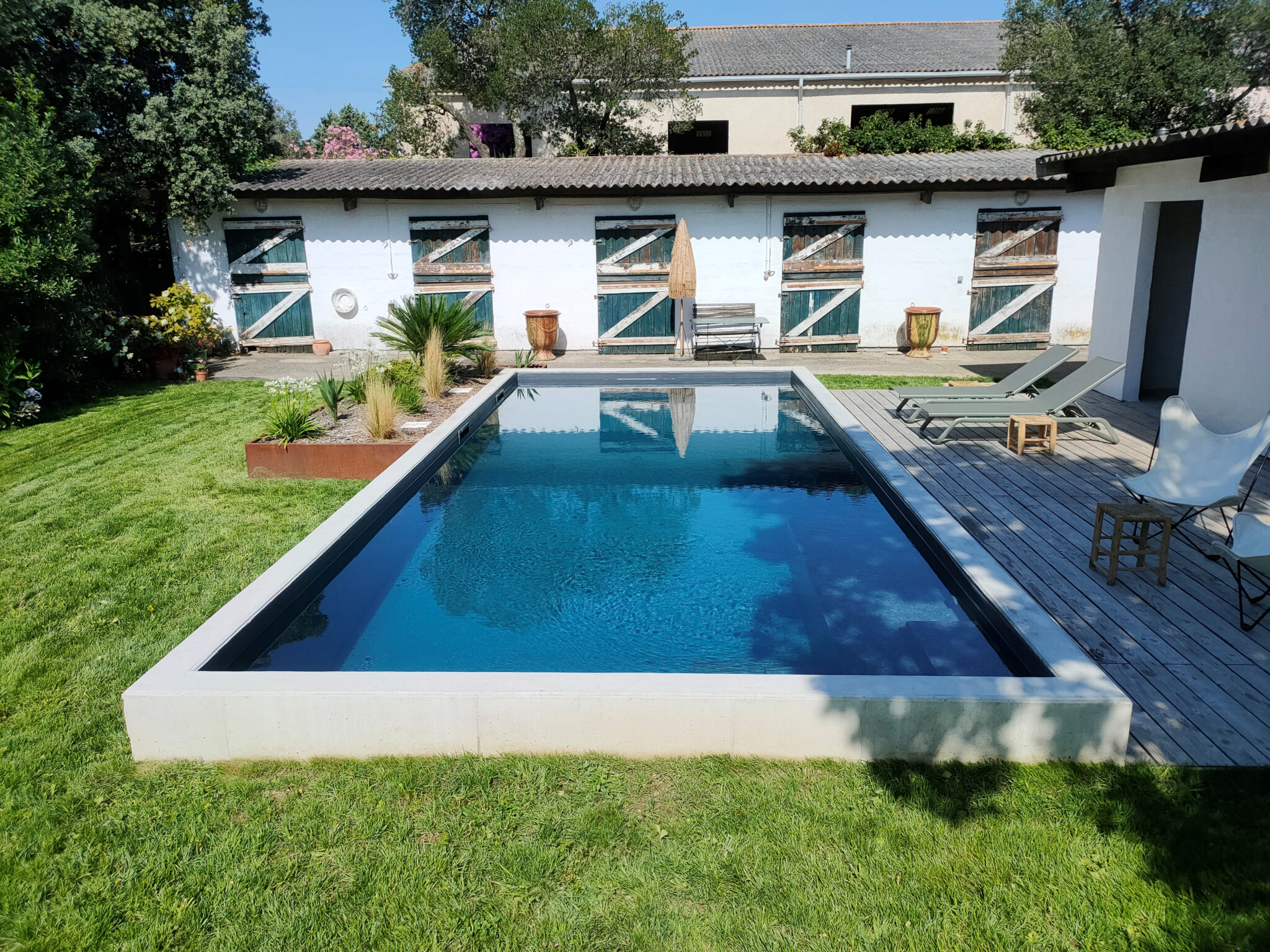 Le revêtement intérieur du bassin de coloris gris anthracite a été pensé pour limiter l’impact visuel de celui-ci. Le rendu en eau, d’un bleu-vert profond, a aussi été inspiré du milieu naturel environnant, comme le Gardon.