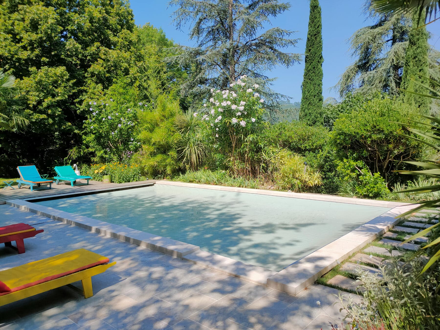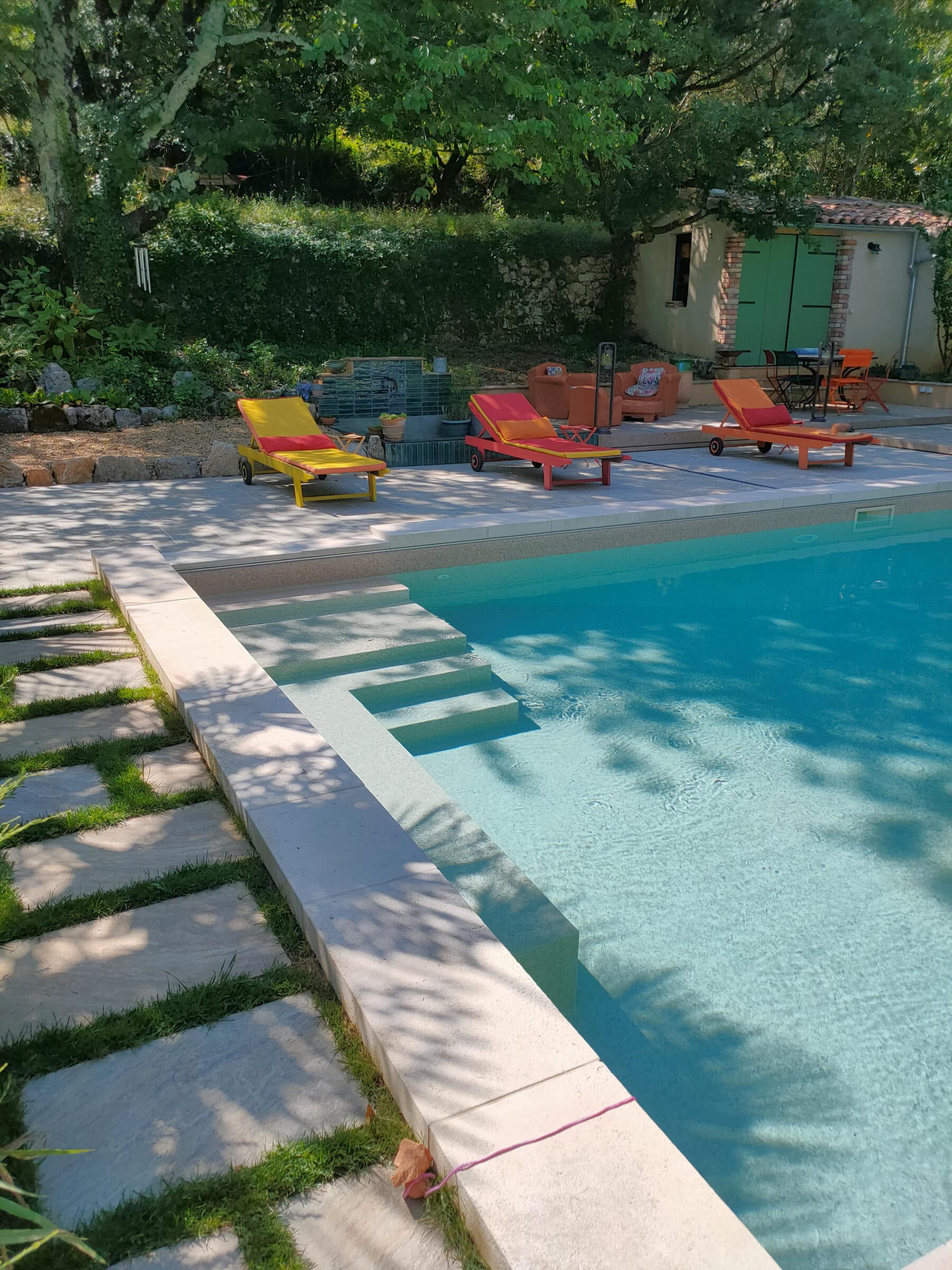 Des couleurs flamboyantes… Une végétation luxuriante… Un soleil de plomb… Cette piscine est une invitation au voyage. Et pourtant, nous sommes dans le Gard! Un bassin aux belles dimensions dans lequel nager et jouer, un revêtement d’étanchéité effet 3D grains de sable pour une eau tropicale, une grande banquette immergée pour profiter des beaux jours. Sécurité du bassin grâce à la couverture automatique, toile coloris vert amande.